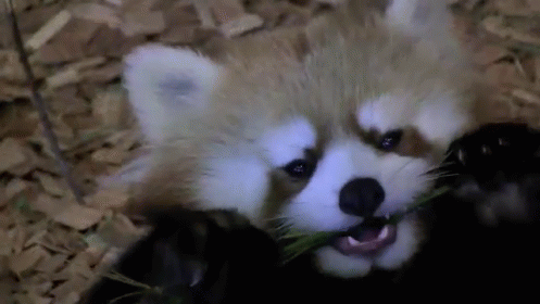 Content Description: a red panda is eating grass with its mouth open and looking at the camera .