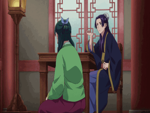 Content Description: a man in a blue robe sits at a table next to a woman in a green shirt