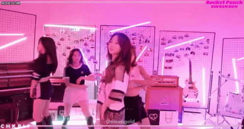 Content Description: a group of girls are dancing in a room with purple lights and a sign that says rocket punch on it