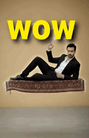 Content Description: a man in a suit is laying on a flying rug with the word wow behind him
