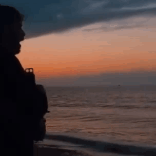 内容说明: a man is standing on a beach looking at the ocean at sunset .
