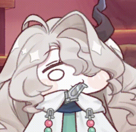 內容說明: a close up of a cartoon character with white hair and horns holding something in her mouth .